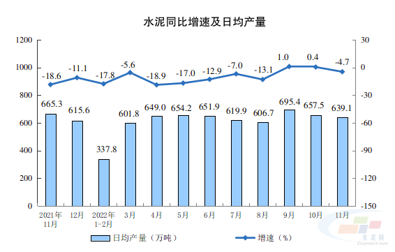2022年11月份,水泥產量19172萬噸,同比下降4.7%;1-11月份,水泥產量195010萬噸,同比下降10.8%。